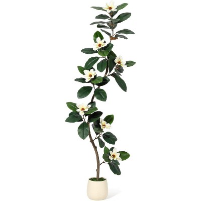 Enhance your interior with this elegant artificial magnolia tree, a stunning accent piece that brings lasting beauty to any space. Each tree features expertly crafted blooms and lifelike leaves, arranged in a weighted pot for stable display. Enjoy the charm of blossoming flowers year-round, all without the need for watering or ongoing care.
