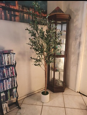 6ft Faux Olive Tree Potted in White Planter, Artificial Tree with 2 Natural Wood Trunks, Realistic Fake Floor Plant for Living Room, Home