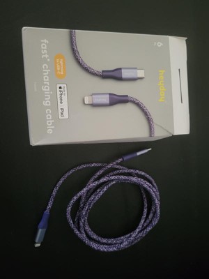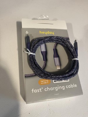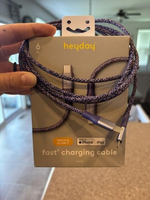 I was looking for this Target "Heyday" Fast Charging Cable (Lightning to USB-C) for my daughter, and she started using it immediately for her iPhone! We always buy the 6-foot cable, so that we can use them not only at home, but in public places like airports, etc. It's difficult to work with a shorter cord. We also prefer this braided cord, as opposed to those made of silicone or plastic, because they hold up much better over time when the cord is bent for phone charges, or for around corners. A+++