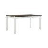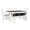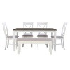 Gather around this handsome six-piece dining set featuring a timeless four post table, four matching chairs, and one bench. Comfortably accommodates six adults. Constructed from rubberwood with an ash wood veneer in a dark gray and smokey white finish, the table offers a natural warmth complemented by the crisp chair upholstery. Neutral hues suit any color scheme while the padded stain resistant upholstery ensures premium comfort. By balancing durability with style, this set offers long-lasting beauty for years to come.