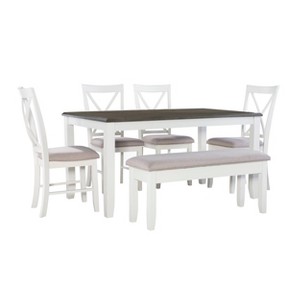 Gather around this handsome six-piece dining set featuring a timeless four post table, four matching chairs, and one bench. Comfortably accommodates six adults. Constructed from rubberwood with an ash wood veneer in a dark gray and smokey white finish, the table offers a natural warmth complemented by the crisp chair upholstery. Neutral hues suit any color scheme while the padded stain resistant upholstery ensures premium comfort. By balancing durability with style, this set offers long-lasting beauty for years to come.