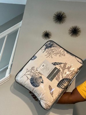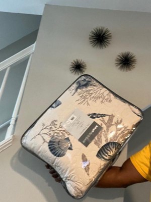 - Features assorted seashells print all over quilt and coral motif in background