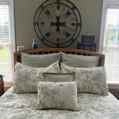 The Laura Ashley Natalie Duvet Cover features a sage green colorway that is a serene, beautiful and it brings a lovely tranquility to this classic floral toile on ivory cotton ground. Coordinated with a crisp shirting stripe on the duvet reverse, European shams and square pillow, this timeless classic fits easily into a modern bedroom. A floral embroidered accent pillow repeats the comforter design and lends a unique, customized detail to the ensemble. Duvet cover features button and tie closure. Machine washable for easy care.