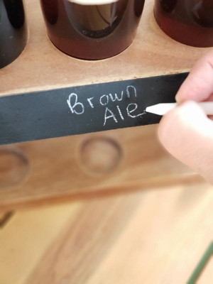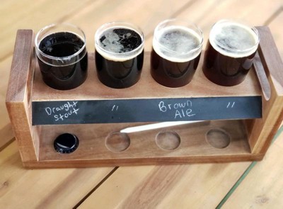 - The chalkboard panel across the beer holder base, soapstone pencil for beer labeling, and hollowed areas below beer sampler glasses for beer caps make for an authentic tasting experience