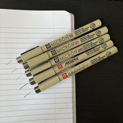 When accuracy, performance and preservation count, the unparalleled fine nibs and archival ink quality of the Sakura Pigma Micron fineliner pens are the go-to tool for art, work, and play. Experience smooth writing, and crisp ink quality that delivers precise points and lines. Features archival Pigma® ink that doesn’t bleed through most papers, is quick drying, waterproof and fade resistant. Certified non-toxic, approved by ACMI toxicologists & bears trusted AP Seal. Not evaluated for cosmetic use on skin. Set is ideal for manga and comic illustrations as well as drawing, doodling, writing & journals. Not recommended for use on fabrics intended to be washed. Set includes 1 each in black ink: Micron 005 - 0.20mm, Micron 03 - 0.35mm, and Micron 08 - 0.50mm fineline pens, Graphic 1mm bullet tip pen, Brush pen, plus 0.7mm Sakura fixed sleeve mechanical pencil.