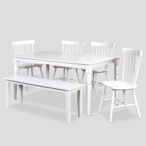 Enjoy meals and gatherings with the 6 Piece Parma Dining Set and Bench from Buylateral. Relax in the inviting spindle-back chairs and bench that complement the rectangular table providing plenty of space for family and larger entertaining occasions. The crisp white finish and style of this set creates a unique focal point in your dining room or kitchen area.