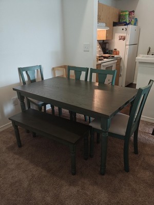 - CHARMING TWO-TONE DESIGN: The rich burnished smoke tabletop beautifully contrasts with a teal blue dry-brushed glaze on the base, chairs, and bench, creating a rustic yet sophisticated aesthetic that complements any dining space.