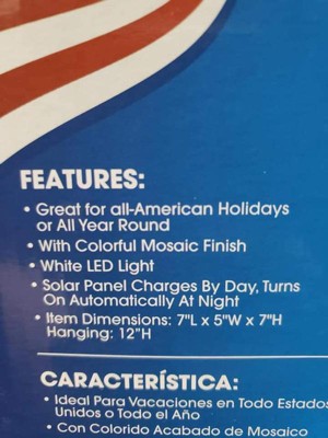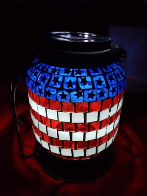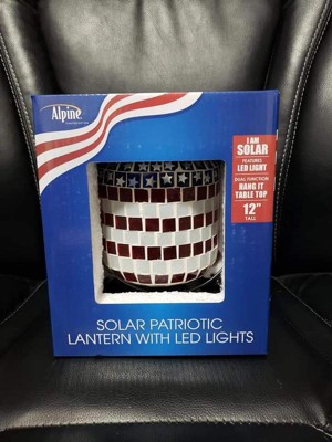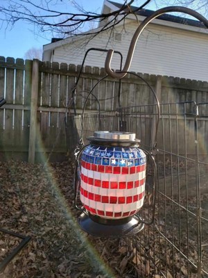 7" Solar Patriotic Glass/Iron Hanging Lantern with LED Lights Cool White - Alpine Corporation: Outdoor Decorative LED Lantern, AA Battery Powered