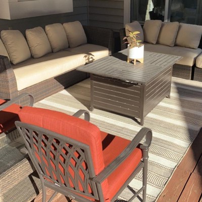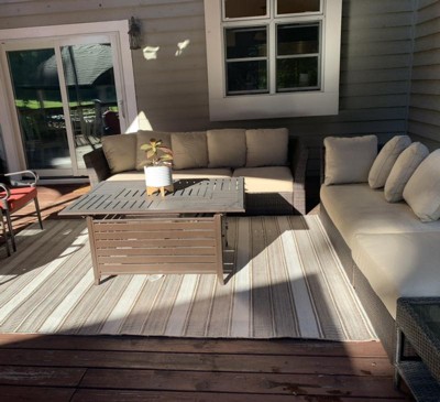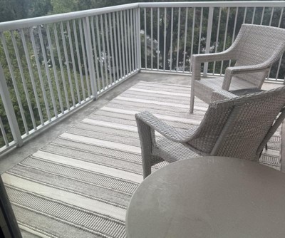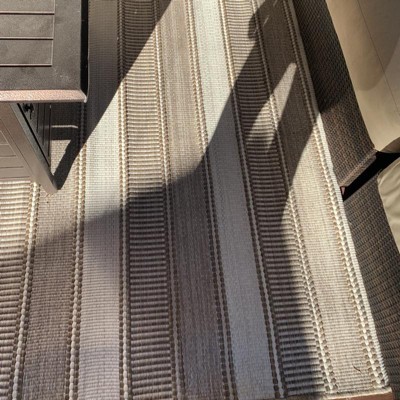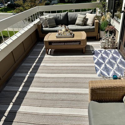 A: The outdoor rug features an allover stripe pattern that adds eye-catching texture.