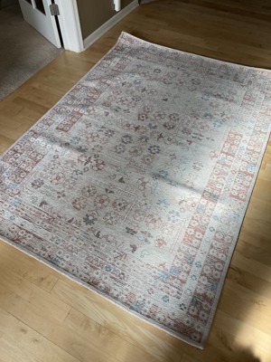 The size of this area rug is nice for a bedroom. It’s a nice thickness as far as it’s not too heavy, and it’s easy to roll out. I found that the corners flattened out against the floor easily and did not curl up. I gave it four stars because I just don’t love the colors. I would say it’s slightly drab but could go with most colors of a room. I’m also not a fan of all of the flowers. I expected to like it more than I do, but I don’t have any major complains about it. I haven’t had to clean it yet.