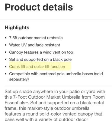 Does not have a crank lift, it is a push up lift and very difficult to push up and to close. Also, no tilt function as described in the copied product details below. No mention of crank left and tilt in manual either. Set up shade anywhere in your patio or yard with this 7-Foot Outdoor Market Umbrella from Room Essentials™. Set and supported on a black metal frame, this market-style outdoor umbrella features a round solid-color vented canopy that pairs well with a variety of outdoor decor schemes. The top of the umbrella is vented for greater stability in windy conditions. The water-, UV- and fade-resistant construction helps to guard against wear from the elements, and "it's equipped with a crank lift system that makes it easy to raise and lower the canopy, along with a collar tilt for more angles of shading."