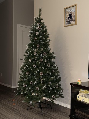 - ECreate instant holiday magic with this Pre-Lit Christmas Tree featuring 150 warm white LEDs that cast a cozy glow in any space! The 352 lush PVC tips dusted with snow and dotted with realistic pinecones create an authentic winter wonderland look.