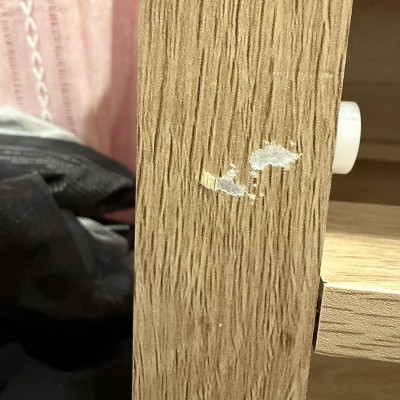 While I like it and assembly wasn’t bad… I’m finally done and I go to peel off the stickers that are placed on the face of the dresser and it pulls to painted wood finish off with it. I now have a fully assembled dresser that has the wood paint finish missing in 2 spots looking like it was old and poorly handled.