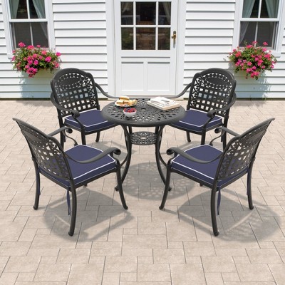 7-Piece Cast Aluminum Outdoor Dining Set: Rectangle Table, Stackable Chairs & Blue Cushions - All-Weather Patio Furniture for Your Backyard