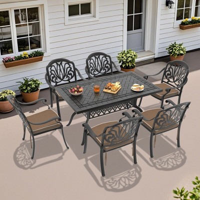 7-Piece Cast Aluminum Outdoor Dining Set with Brown Cushions, Rectangle Table & Stackable Chairs - for Patio, Backyard