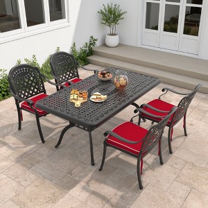 5-Piece Cast Aluminum Outdoor Dining Set with Red Cushions, Rectangle Table & Stackable Chairs - for Patio, Backyard