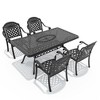 This 5-piece patio furniture dining set is crafted from rust-resistant and weather-resistant cast aluminum frames with high-performance powder coating, ensuring durability and against rust, scratches, and rays. Each chair is ergonomically designed for comfort and comes with cushions, while the stackable design saves storage space. The table's hole (1.88" diameter) allows for shaded relaxation during sunny or rainy days. Adjustable feet ensure stability on uneven surfaces. Assembly is quick and straightforward, with all hardware and instructions provided.