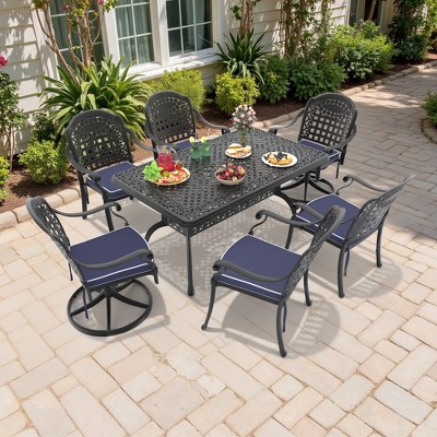 7-Piece Cast Aluminum Patio Dining Set with Rectangle Table, 2 swivel chairs and 4 fixed dining chairs, Brown Cushions and Umbrella Hole