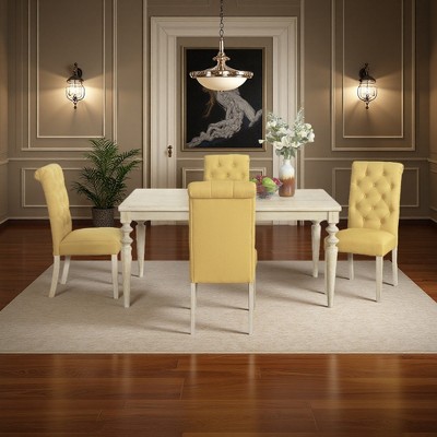 - HIGHLIGHTS: The dining table features a turned leg design, which adds both stability and style. It has a wired-white finish and showcases a natural wood grain texture, offering an elegant look. The chairs are designed with button-tufted details, providing a touch of sophistication. Chair legs are finished in an oak color that complements the table perfectly. Indulge in the allure of this exquisite dining set and elevate your home decor.