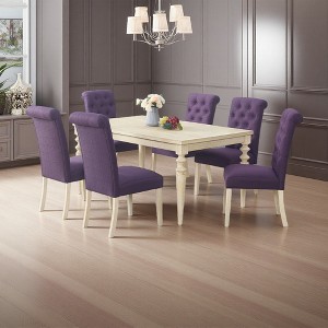 - HIGHLIGHTS: The dining table features a turned leg design, which adds both stability and style. It has a wired-white finish and showcases a natural wood grain texture, offering an elegant look. The chairs are designed with button-tufted details, providing a touch of sophistication. Chair legs are finished in an oak color that complements the table perfectly. Indulge in the allure of this exquisite dining set and elevate your home decor.