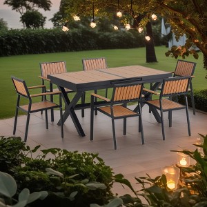 This innovative outdoor dining set includes a versatile extendable table and six chairs, offering flexible seating arrangements for your patio, garden, or balcony. Crafted with high-quality plastic wood panels and durable iron frames, this set provides both modern aesthetics and long-lasting performance, perfect for any outdoor gathering.