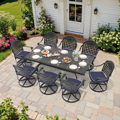 7-Piece Rectangle Cast Aluminum Outdoor Patio Dining Set with Swivel Chairs & Red Cushions & Umbrella Hole