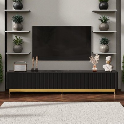 Elevate your living room with this 70.8" modern minimalist TV stand for TVs up to 80". The wood-grain veneer tabletop pairs with refined gold accents and curved, vertically-grooved sides for understated luxury. Two cabinets, three drawers, and an open shelf keep media devices and daily items neatly organized.