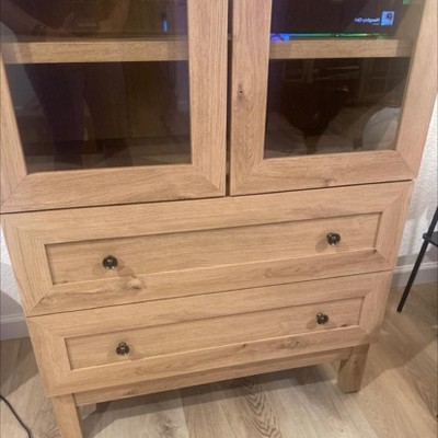 My husband and I are happy with this cabinet! It looks beautiful in our living room. The drawer that goes in and out feels a bit cheap, but everything else feels sturdy once put all together! Our favorite part are the adjustable shelves in case we change our minds when it comes to the placement of the shelves. Also, the glass doors give this cabinet a nice design. My husband & I definitely recommend to assemble this cabinet with 2 people! And it will take some time to assemble (it took us roughly 3 hours). Rest assured, the instructions that came with this cabinet are great too. Overall, we are keeping this product. It is worth it for us and is a good addition to our home!