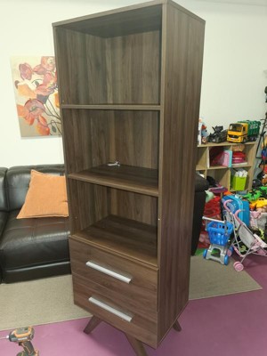 Increase your home's storage options with the Mid-Century inspired 71" tall Ashfield Tower from Buylateral. This upright bookshelf tower offers two lower drawers for storing magazines or CDs, and three open shelves to display books, family photographs and decorative accessories. Constructed from durable laminated MDF with a warm Walnut finish, accented with Rubberwood angled legs for a retro vibe.