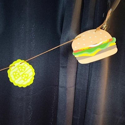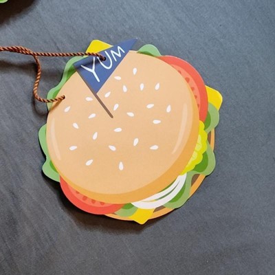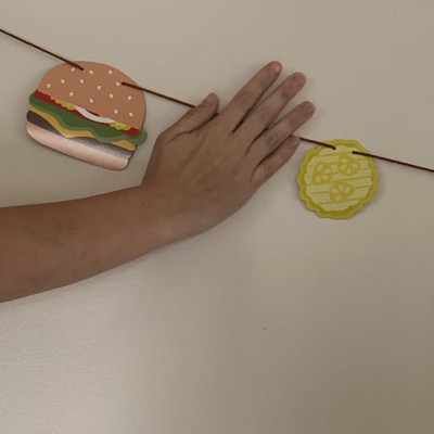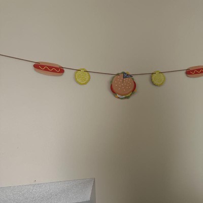 [This review was collected as part of a promotion.] This is such a fun and whimsical party garland - the burgers and hot dogs with pickles are so nicely made on a sturdy type card stick style paper connected with string that has a loop on each end to hang the garland easily. This comes at an excellent price point and is easy to take out of the package and hang right up. You can adjust the pieces as needed if they slide around. I received an incentive to write this review.