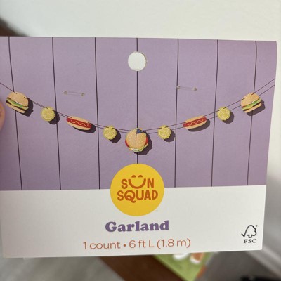 Add a fun twist to your party decor with this 72" Hot Dog Hamburger Paper Garland from Sun Squad™. Bright, colorful and easy to hang, this dangler is perfect for backyard barbecues, birthday parties or summer get-togethers. With playful food-themed designs, it brings instant charm to any space. Just hang it up and let the good vibes roll.