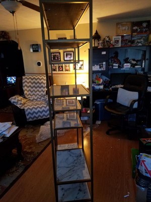 This was the cheapest decorative gold bookshelf I could find. For the price I paid, I am extremely happy. The marble isn’t real, but I have a toddler, so I’m actually happy about it because they won’t break as easily. They still look beautiful and feel smooth like marble. I purchased two and have them side by side so that they look like a mirror image, and they look fantastic for my glam living room. They’re sturdy and come with the necessary parts to secure them to the wall.