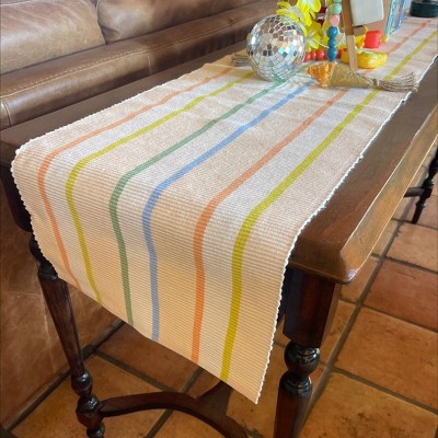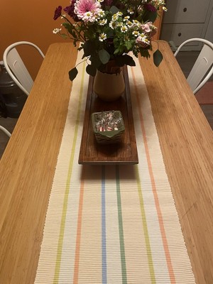A: The table runner is rectangular in shape, measuring 72 inches long and 14 inches wide.