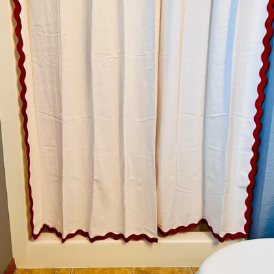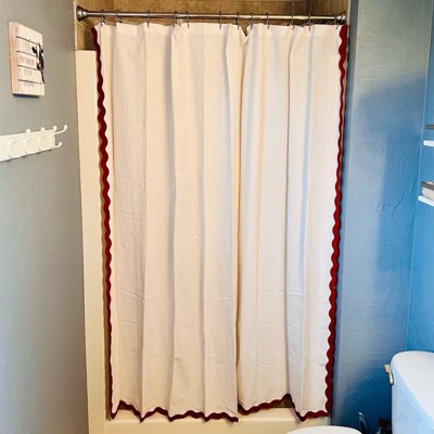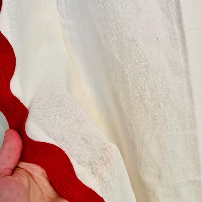Transform your bath space for the season with this Scalloped Christmas Shower Curtain from Threshold™. Made from 100% cotton, the decorative shower curtain features a buttonhole top for easy installation and is machine washable for a quick refresh whenever needed. It showcases a crisp cream-color surface trimmed with red scalloped edging on the sides and bottom to beautifully enclose your bathtub or shower stall for enhanced privacy and style.