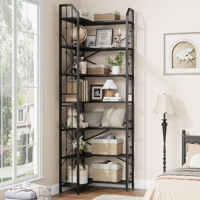 - [Stable and Safe] This tall corner bookshelf is crafted from premium MDF boards and metal frame to ensure long-lasting durability for daily use. Each tier can support up to 60 pounds. The equipped anti-tipping strap prevents any risk of accidental tipping or instability.