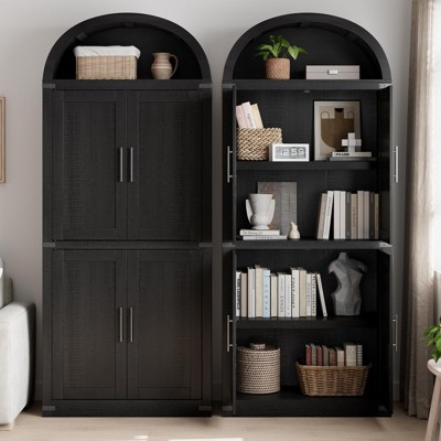 72" Tall Arched Bookshelf Cabinet, Modern Farmhouse Wood Bookcase with 4 Glass Doors & Open Shelf
