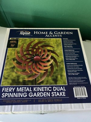 Add a touch of ambience to your patio, lawn, or garden with the Alpine Corporation Dual Spinning Kinetic Metal Stake. This durable, colorful spinner is made of metal to withstand the harshest wind conditions and last throughout all seasons. The rustic red and orange blades are a stylish addition to your outdoor space. The colors blend together as the wind swirls the spinners to create a beautiful color collage resembling a fire or sunset. The spinner is the perfect portable decor for lining your driveway, walkways or planting beds to be easily seen and admired by passers-by. The garden wind spinnerl includes a one-year limited manufacturer's warranty for quality you can rely on. The Alpine Corporation Dual Windmill Stakes measure 15" x 7" x 75", the perfect size for your lawn. Alpine Corporation is one of America's leading designers, importers, and distributors of superior quality home and garden decor products. Alpine's award winning in-house design team continuously develops new and innovative "statements pieces" for your home and garden. Your outdoor living spaces will be the envy of the neighborhood with our wide assortment of fresh, fashionable and contemporary products, from beautifully crafted solar garden stakes featuring patented motion and fiber optic lighting technology to gorgeous glass and glow-in-the-dark bird baths and feeders.