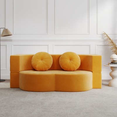 78.7" Orange Modern Convertible Floor Sofa Bed with Round Pillows, Plush Corduroy Sleeper for Small Spaces and Guest Rooms -3irtyhousy