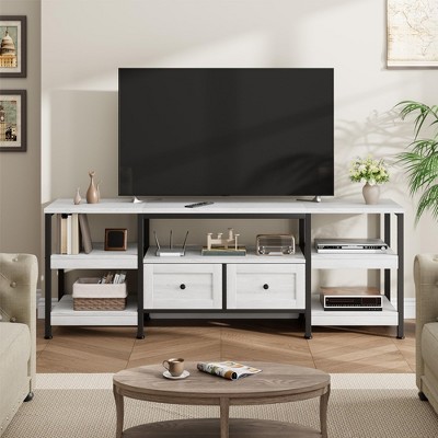 Bring modern industrial style to your space with this 79" TV Stand, perfect for TVs up to 85". Crafted with a sturdy MDF wood grain finish and black steel frame, it combines durability with bold design. Two spacious fabric drawers and adjustable open shelves provide versatile storage for gaming consoles, DVDs, and d¨¦cor, keeping your area organized. Supporting over 120 lbs with a scratch-resistant surface, this media console ensures long-lasting stability. Easy-to-follow instructions and pre-drilled parts make assembly quick and hassle-free.