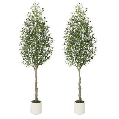 - 🕊️【Realistic Faux Olive Plant】This 6-foot artificial olive plant features lifelike PE trunk and faux silk leaves, giving it a sculptural appearance, complemented by vivid leaves for an artistic and authentic look. The trunk divides into several leaf segments, adorned with dozenes of rubber fabric fruits. The clear texture and natural colors of the olive leaves make this artificial tree an ideal home and office decora