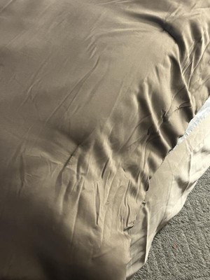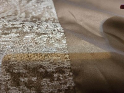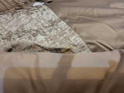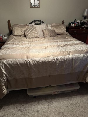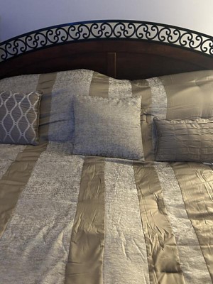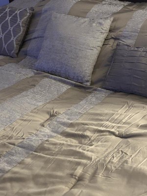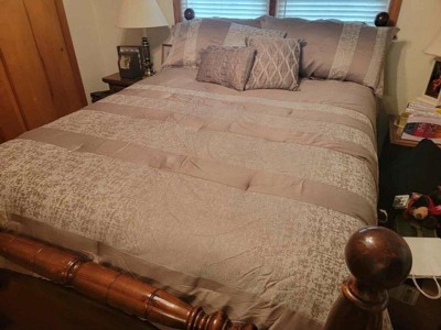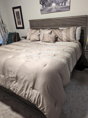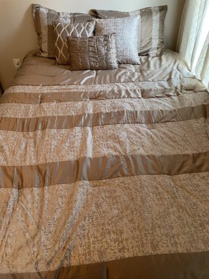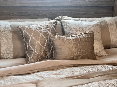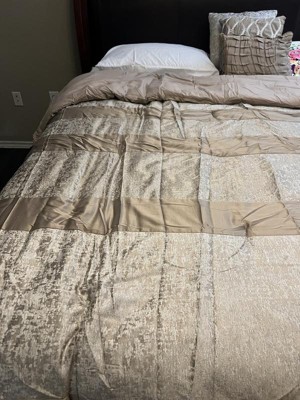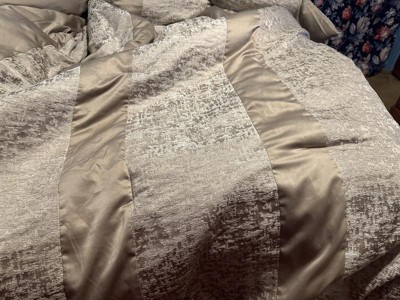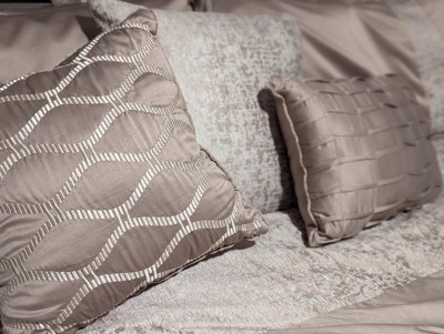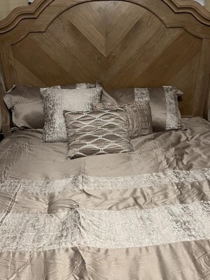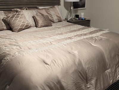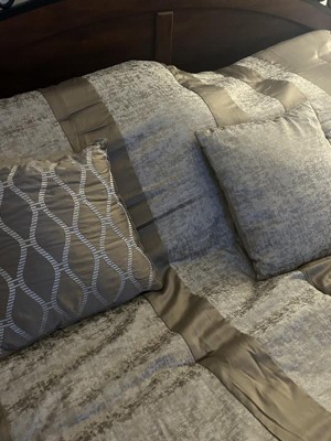 - Luxurious chenille jacquard pieced in taupe matte charmeuse comforter set