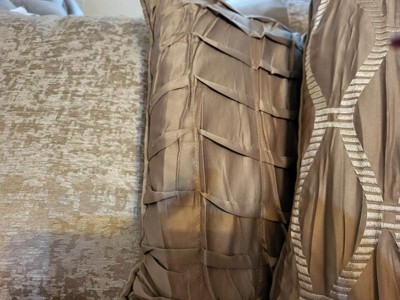 - Pillows have embroidery and pleating details