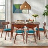 Set the tone of your home by creating an engaging area for all to gather with the 7- Piece Archer Dining Set from Buylateral. Constructed of solid beech wood in a rich walnut finish, the table and chairs feature angled tapered legs that offers a Mid-Century modern flair. Cushioned chair seats upholstered in a rich Teal linen-like fabric provides extra comfort when gathering for hours with family and friends. While the soft curves and smooth edges of the table present a more causal appeal which suits both formal dining areas as well as kitchen eating spaces.