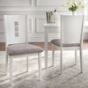 - White finish with upholstered gray linen like cushioned seats