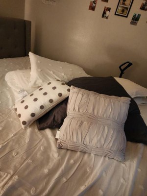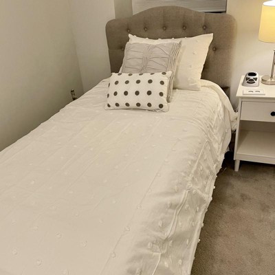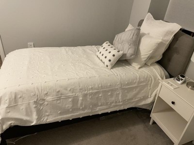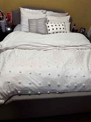 [This review was collected as part of a promotion.] I love this bedding set, it’s simple and pretty. All white with the soft Pom Pom dots giving it a pretty detail without being too much. It washed and bleached really well and I love that it came with euro shams, pillow cases and two throws.