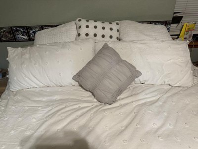 [This review was collected as part of a promotion.] I love this set. Not gonna lie, I’m not one of them fancy folks with duvet covers for every season and my insert is just a comforter I already had lol. Wasn’t sure I’d like the white color. I have animals… 4 of the 6 spend more time on my bed than I do. (I have a cover blanket that goes over the duvet just for that reason). My favorite part is all of the different designs and textures.. there’s a quilted look, rouched look, colored dots, and then the white raised dots. I thought for sure it would be uncomfortable but surprisingly it’s pretty gently to the touch. It comes with two accent pillows which I like cuz I won’t spend money on extra small pillows for decoration. It also has two quilted pillow covers and two duvet cover matched covers. That’s a lot of pillows!!! Some people complained about the color sort of yellowing, but I didn’t have that issue. You can see in the pictures that it’s pretty darn white. Of course, I washed it before I put it on my bed and it held up fine. Not grays, loose stitching, or seam holes in cover. I would definitely look into this product line again when I want another bed set. *thumbs up*
