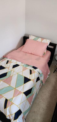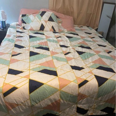[This review was collected as part of a promotion.] Upon receiving the Geo Pink/Blue 7 piece bedding set in its bag, we discovered that it was well-packaged and easily accessible. As we proceeded to unpack and arrange the bedding on the bed, our anticipation to experience its comfort grew. The pillow cases astounded us with their remarkably soft texture, while the comforter exhibited an ideal weight suitable for all seasons. Although initially intended for a queen bed my daughter wanted it on her twin. It is a great snug fit on a queen.. Additionally, the set exudes a chic and elegant appearance, providing a subtle burst of color to the room. Overall, this bedding set greatly surpassed our expectations.