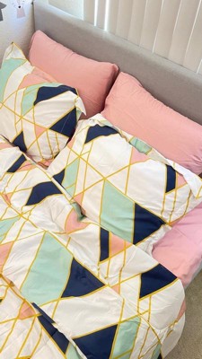 This modern geometric pattern with navy, teal, and pink shapes separated by gold lines is the statement print for this bed. The pillow shams use the geometric print for the face. To complete the bed, this ensemble comes with sheets and pillowcases in a coordinating wide stripe pattern with shades of pink. The entire set is machine washable, making this a convenient addition to your home. Includes one comforter (102x86 inches), two king shams (20x36 inches), one flat sheet (102x102 inches), one fitted sheet (78x80 inches) with a 12" pocket to fit up to a 15" mattress, and two king pillowcases (20x40 inches) Comforter is a printed 100% microfiber fabric with a 180 GSM fill. Sheet set and printed sham(s) are 100% microfiber. This item is machine washable, but please be sure to use appropriate sized machinery to avoid any excess wear on the items.