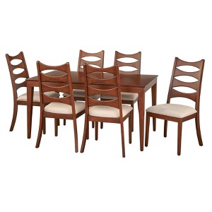 The Lydon 7-piece dining set by Lifestorey is perfect for contemporary dining rooms. Inspired by midcentury-modern designs, its’ clean minimalist lines give this table a fresh and modern look. Tapered shaker style legs enhance this midcentury table style. Crafted of solid beech wood with a veneered MDF top, the table displays a beautiful wood grain in a warm Walnut finish. The set of six coordinating dining chairs feature open circular cut-out backs in solid beech wood with a comfortable cushioned upholstered seat in a soft gray linen-like fabric. This beautiful rich walnut finished 7-piece dining set provides balance and durability, an eye catching choice for any transitional décor.