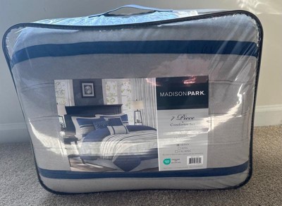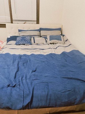 [This review was collected as part of a promotion.] The Madison Park Palmer Comforter Set King, Blue is nice but color does not match there is a strip in between gray that is a darker nice blue than the bigger section above gray is lighter denim look. It is a nice material. The set does fit nicely on bed.